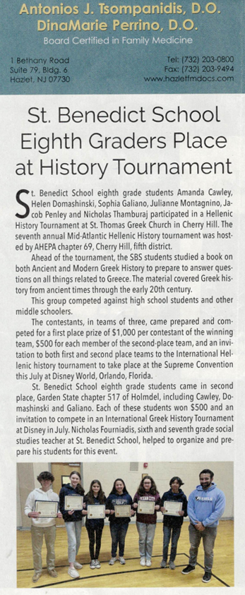 St. Benedict School eighth grade students came in second place, Garden State chapter 517 of Holmdel, including Cawley, Domashinski and Galiano. Each ol these students won SSOO and an invitation to compete in an International Greek History Tournament at Disney in July. Nicholas Foumiadis,sixth and seventh grade social studies teacher at St Benedict School, helped to organize and prepare his students lor this event.